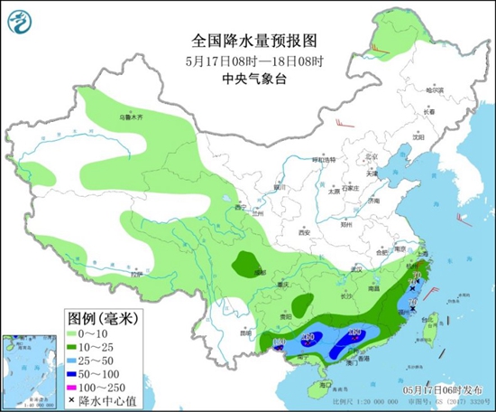 17日,江南东部和南部、华南、四川盆地西部、贵州东部等地的部分地区有中到大雨,局地有暴雨或大暴雨,并伴有短时强降水,局地有雷暴大风或冰雹天气。